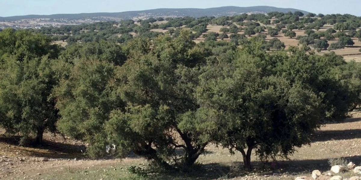 Essaouira est la porte d’entrée la plus au nord de l’arganeraie. Sur l’unique route reliant Marrakech à Essaouira, les herbes grillées laissent vite place à un interminable et monotone désert rocailleux. Les quelques oliviers clairsemés sur les petites collines commencent à se mêler aux arganiers plus touffus, et les enseignes attirant le chaland vers de petites échoppes d’huile d’argan se multiplient. L’arganeraie, qui compte environ vingt millions d’arbres et s’étend sur plus de 800 000 hectares, n’est pas une forêt comme les autres. Loin des forêts tropicales et des forêts tempérées, elle se présente comme une savane clairsemée de petits arbres touffus et ramifiés entre lesquels la paille, la roche ou la terre brute forment de petites clairières. Des paysages uniques, agrémentés d’images surprenantes, comme celles de ces chèvres acrobates que l’on trouve perchées en nombre sur les maigres branches, dévorant goulûment les épines de l’arganier.