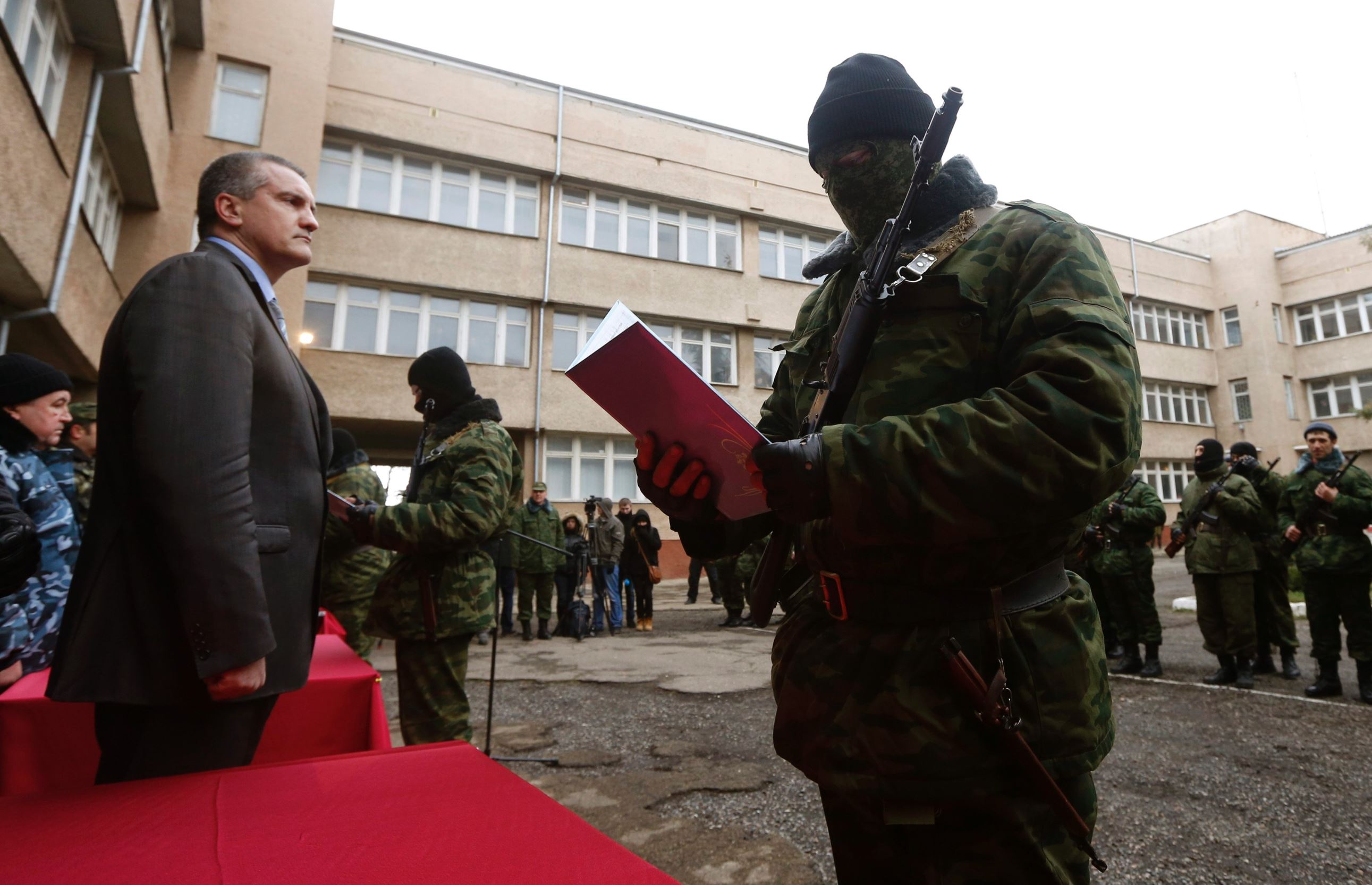 Suite à la révolution de février, le paysage politique ukrainien a rapidement été bouleversé. Refusant de reconnaître le nouveau gouvernement de Kiev et qualifiant la révolution de « coup d’état », la Russie a choisi de renforcer ses installations militaires existantes sur l’île de Crimée. Tandis que des troupes non identifiées sécurisaient les bâtiments gouvernementaux, des séparatistes pro-russes ont cherché à consolider leur domination locale et Sergey Aksyonov s’est déclaré premier ministre de Crimée.