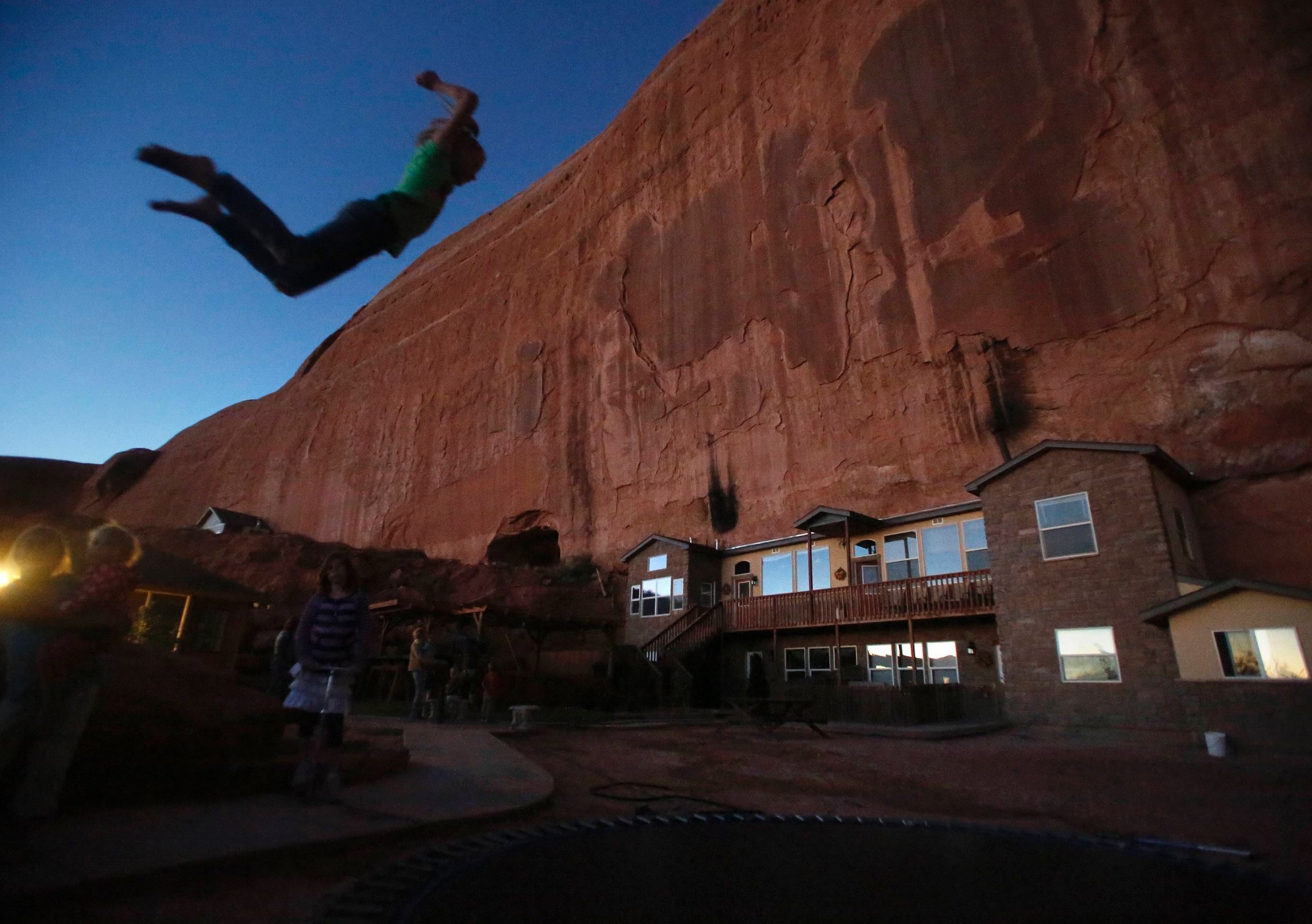 De jeunes filles jouent sur un trampoline devant une maison directement taillée dans la paroi rocheuse, à Rockland Ranch community. La paroi, ou « The Rock », comme l’appellent les habitants, existe depuis environ 35 ans à partir d’une formation de grès non loin de Canyonlands.