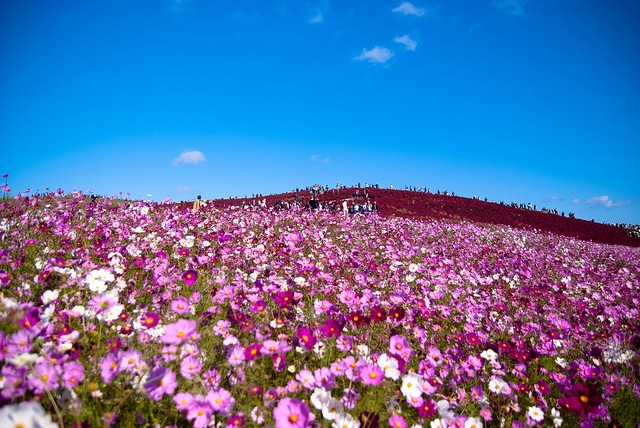 Situé à moins de deux heures de Tokyo, le parc public se trouve dans la ville de Hitachinaka dans la préfecture d’Ibaraki. Chaque mois d’avril, les 190 hectares d’espaces verts se transforment en un océan de fleurs bleues. Les locaux appellent ça le « Nemophila Harmony » à cause de la petite fleur bleue Némophile (nemophila).