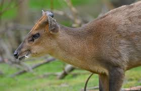 Le muntjac de Reeve est un petit cervidé primitif qui vit en Asie du sud. Il est reconnaissable à son front barré de deux lignes noires et à sa petite taille. C'est un animal habitué à se cacher la journée dans les broussailles et les hautes herbes en forêt, et ne sort que pendant la période de rut (parce qu'il faut faut bien perpétuer l'espèce).